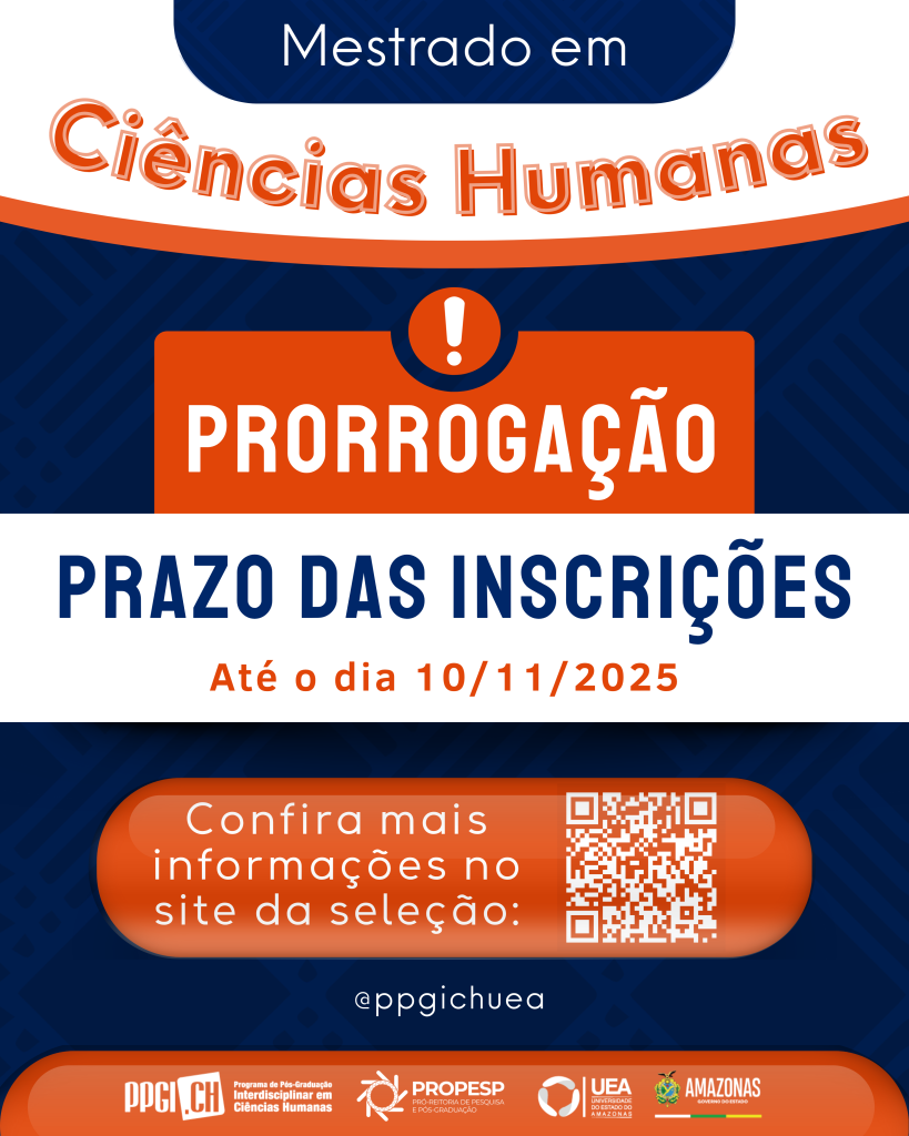 O Programa de Pós-Graduação Interdisciplinar em Ciências Humanas (PPGICH/UEA) informa que foi prorrogado o prazo de inscrições para o Mestrado em Ciências Humanas até o dia 10 de novembro de 2025. O curso oferece 23 vagas, distribuídas entre os polos de Manaus e Tefé.