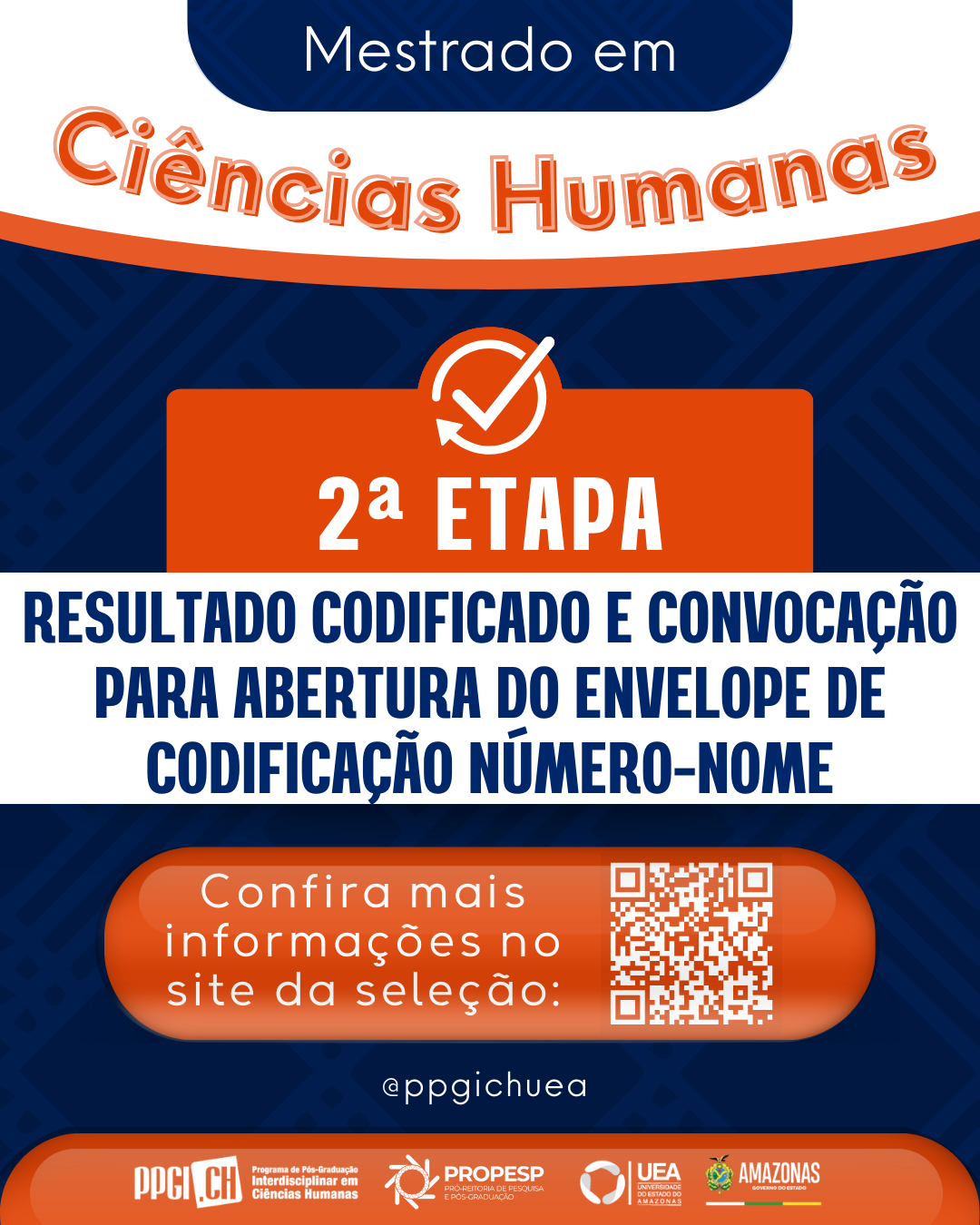 A Coordenação do Programa de Pós-Graduação Interdisciplinar em Ciências Humanas (PPGICH/UEA) divulga o resultado codificado da 2ª Etapa do Processo Seletivo 2025/2026, referente à Prova Escrita de Conhecimento Específico, bem como o aviso oficial de abertura e rompimento do lacre dos envelopes de codificação número-nome.