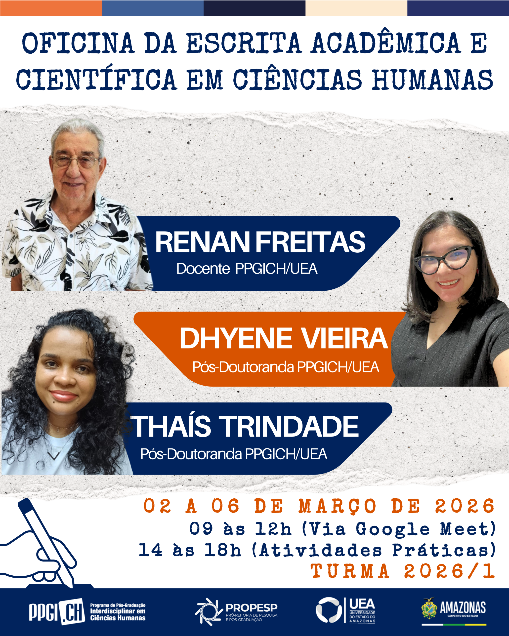 O Programa de Pós-Graduação Interdisciplinar em Ciências Humanas da Universidade do Estado do Amazonas (PPGICH/UEA) realizará, no período de 02 a 06 de março de 2025, a Oficina de Escrita Acadêmica e Científica em Ciências Humanas, voltada aos discentes ingressantes do Programa.