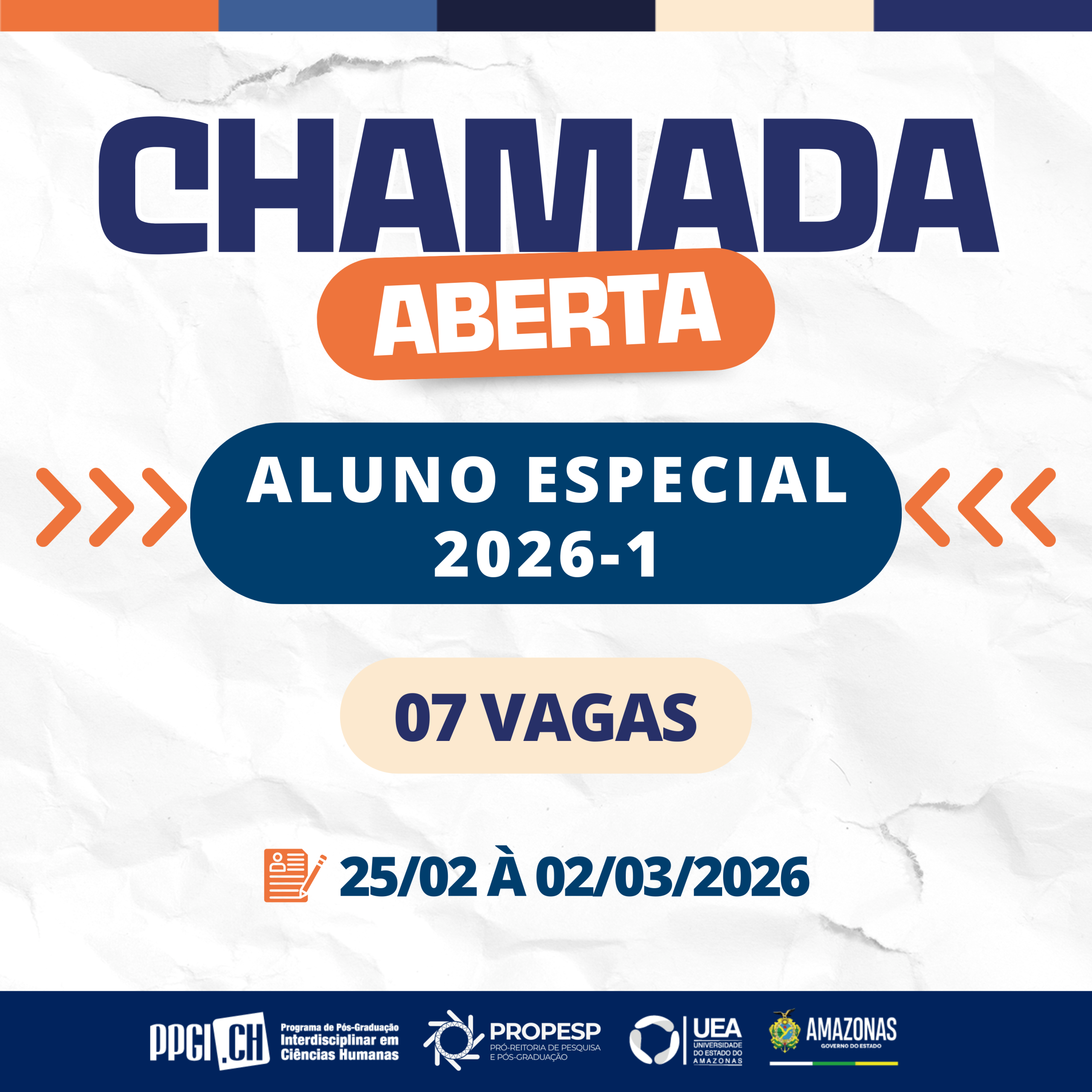 O Programa de Pós-Graduação Interdisciplinar em Ciências Humanas da Universidade do Estado do Amazonas (PPGICH/UEA) torna pública a abertura de 07 (sete) vagas para Aluno Especial no semestre letivo 2026.1, ofertadas conforme o quadro de disciplinas disponibilizado no aviso oficial.