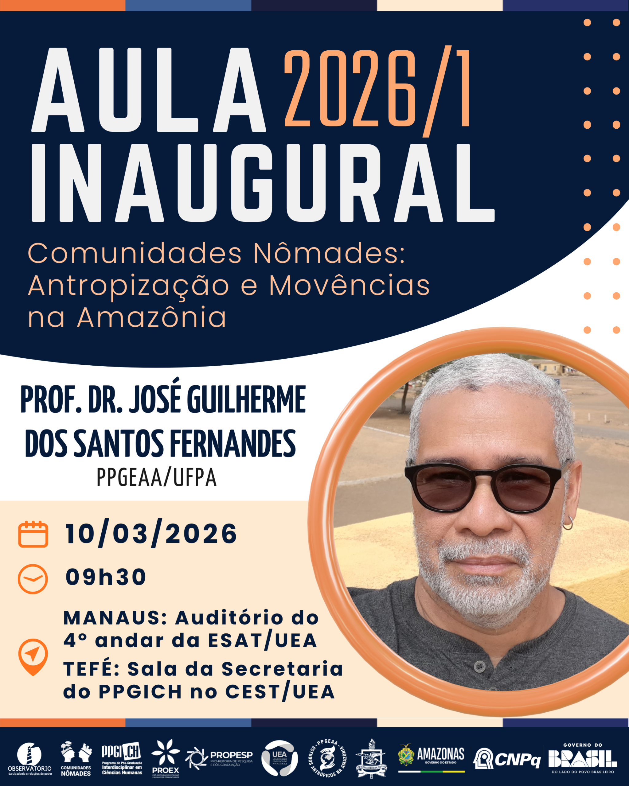 A conferência será ministrada pelo Prof. Dr. José Guilherme dos Santos Fernandes, docente do Programa de Pós-Graduação em Estudos Antrópicos na Amazônia (PPGEAA/UFPA), com o tema “Comunidades Nômades: Antropização e Movências na Amazônia”.