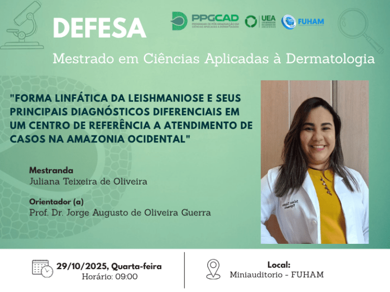 A Coordenação do Programa de Pós-graduação em ciências aplicadas à dermatologia da Universidade do Estado do Amazonas, em convênio com a Fundação Hospitalar Alfredo da Matta, tem a grata satisfação de convidá-los (as) a prestigiarem a defesa de mestrado do…