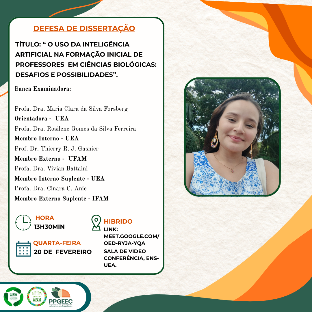 O Programa de Pós- Graduação em Educação em Ciências na Amazônia (PPGEEC), convida a todos para defesa da dissertação da Mestranda Adriely Reis Pereira, que tem como título: “ O USO DA INTELIGÊNCIA ARTIFICIAL NA FORMAÇÃO INICIAL DE PROFESSORES EM CIÊNCIAS BIOLÓGICAS: DESAFIOS E POSSIBILIDADES”. A defesa acontecerá no dia 20 de Fevereiro de 2026, presencial, às 13h30 (horário Manaus) Acesso remoto: meet.google.com/oed-ryja-yqa