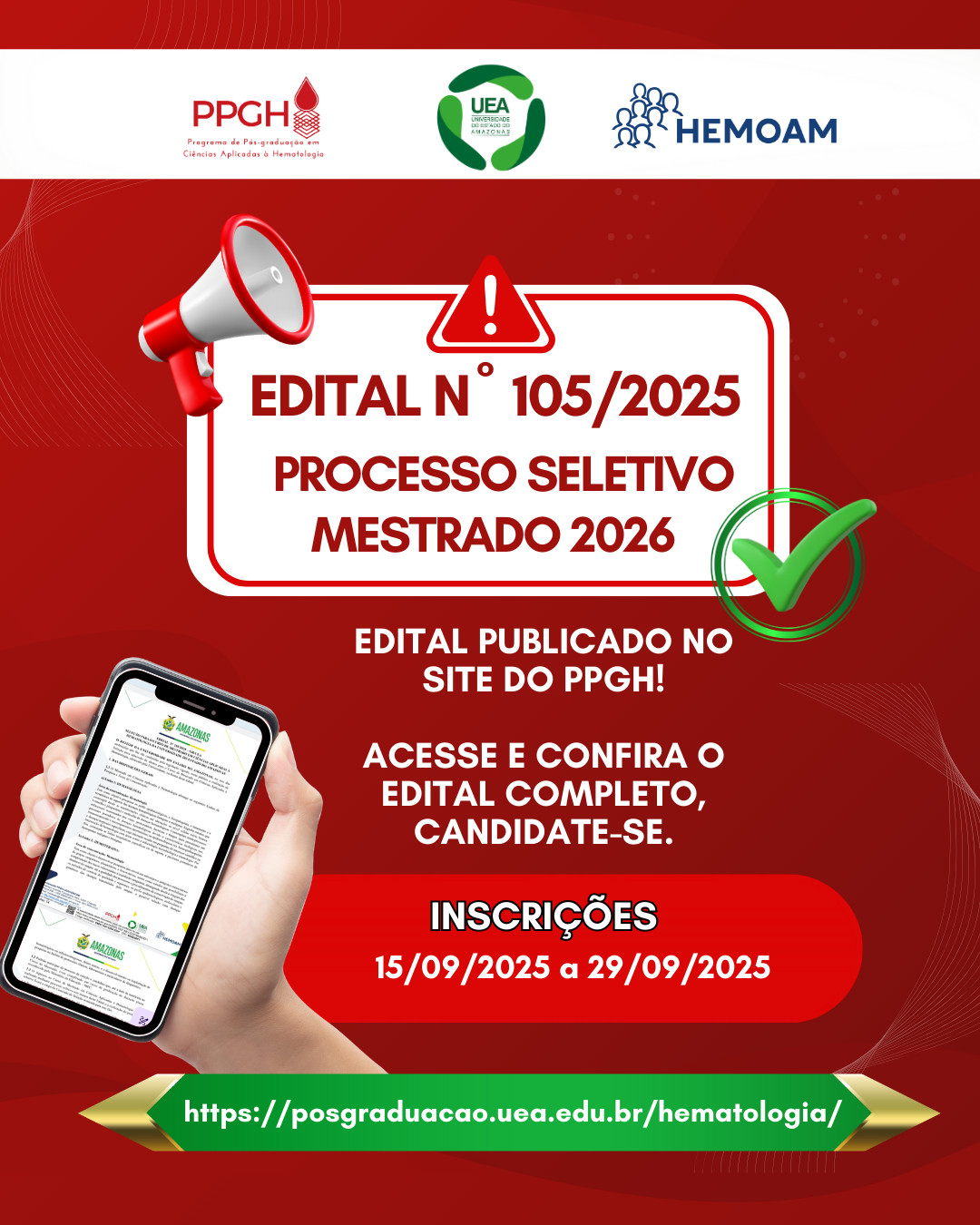 A Coordenação do Programa de Pós-graduação em Ciências Aplicadas à Hematologia UEA/HEMOAM parabeniza o aluno…