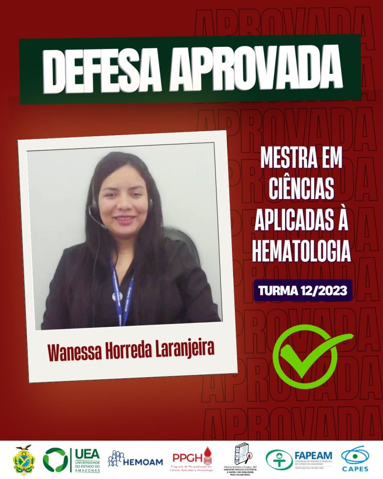 A Coordenação do Programa de Pós-graduação em Ciências Aplicadas à Hematologia UEA/HEMOAM parabeniza a aluna Wanessa Horreda Laranjeira por sua aprovação na Defesa de Dissertação de Mestrado. Tema do Projeto: “AVALIAÇÃO DO PERFIL DE MEDIADORES IMUNOLÓGICOS SOLÚVEIS EM PACIENTES COM…