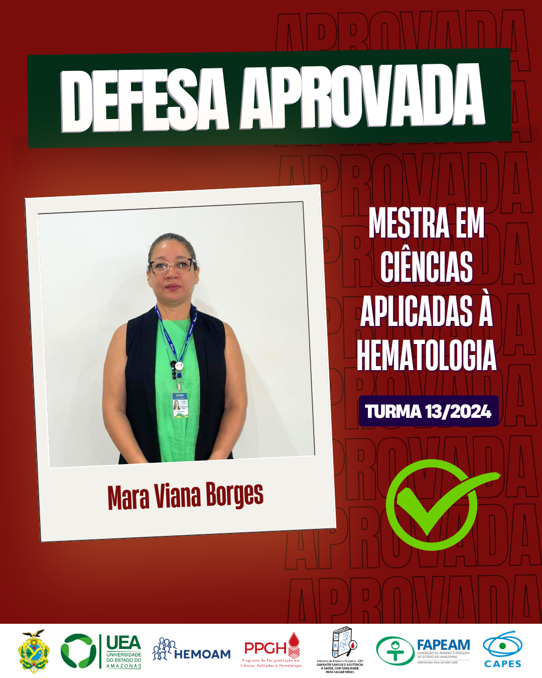 A Coordenação do Programa de Pós-graduação em Ciências Aplicadas à Hematologia UEA/HEMOAM parabeniza a aluna Mara Viana Borges por sua aprovação na Defesa de Dissertação de Mestrado.