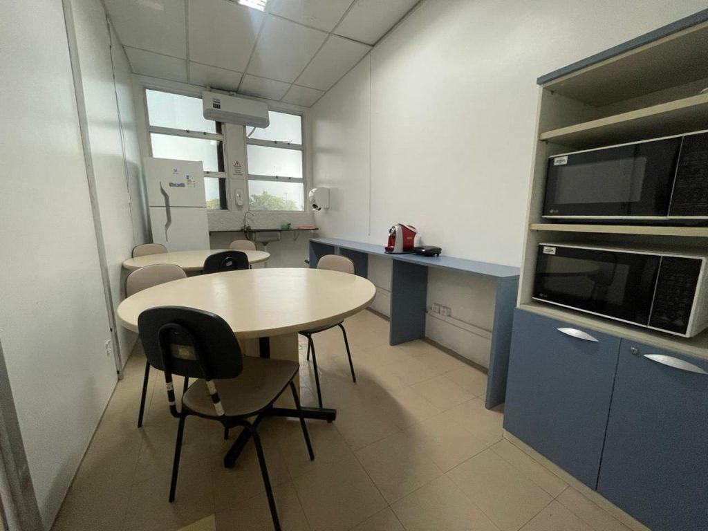 Espaço comum para refeições e realização de pequenos eventos que dispõe de geladeira, 02 aparelhos microondas, cafeteira, ar-condicionado e pia instalada.