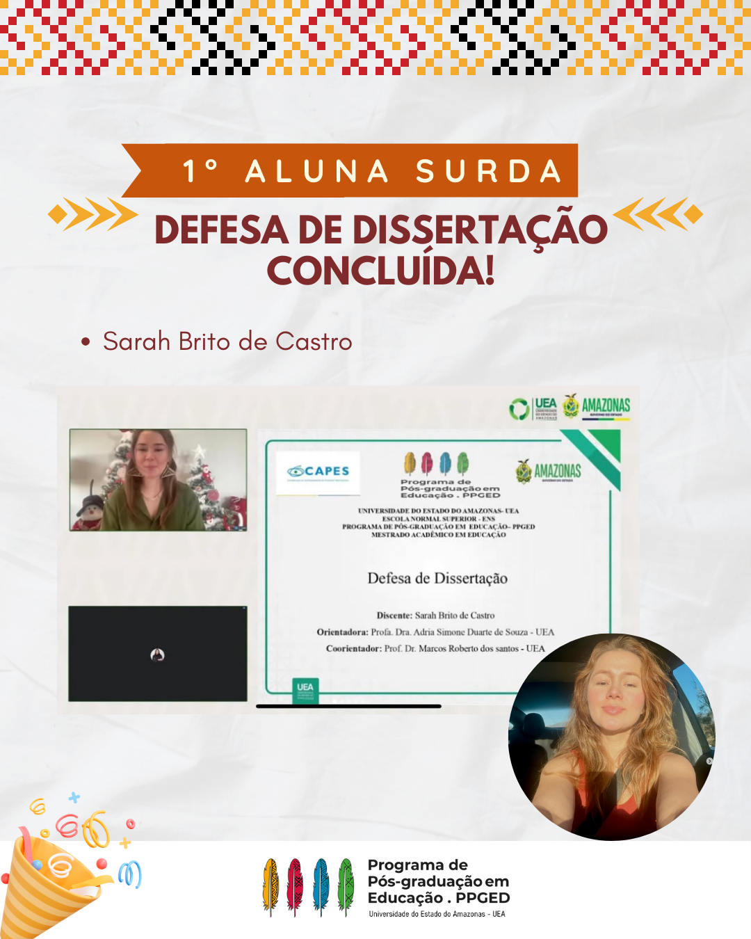 O Programa de Pós-Graduação em Educação (PPGED/UEA) vive um momento histórico com a defesa de dissertação da primeira aluna surda do programa. A conquista representa um avanço significativo para a inclusão e acessibilidade na pós-graduação, reafirmando o compromisso do PPGED/UEA com uma educação cada vez mais plural e acessível!