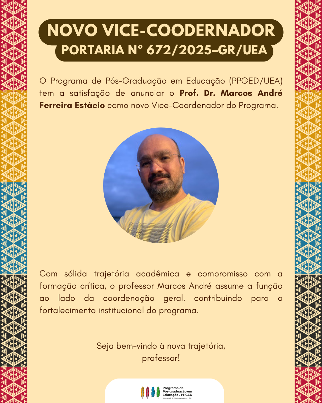 O Programa de Pós-Graduação em Educação (PPGED/UEA) tem a satisfação de anunciar o Prof. Dr. Marcos André Ferreira Estácio como novo Vice-Coordenador do Programa.