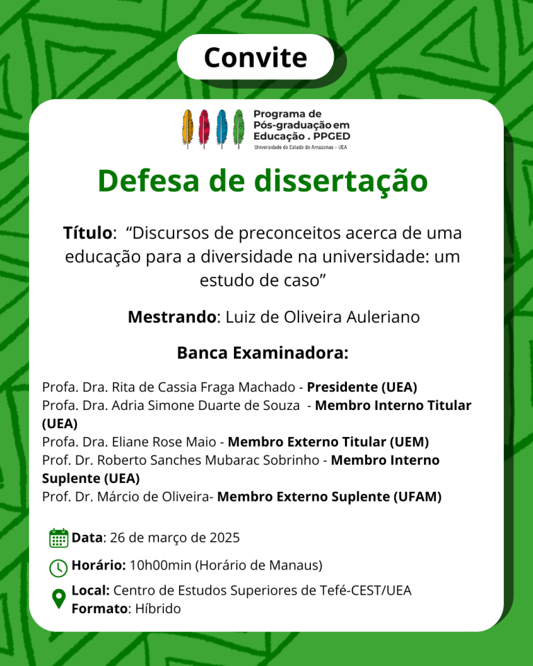 Defesa de Dissertação 🎓 O Programa de Pós-Graduação em Educação (PPGED), convida a todos para a Defesa de Dissertação do mestrando Luiz de Oliveira Auleriano, que tem como Título: “Discursos de preconceitos acerca de uma educação para a diversidade na…